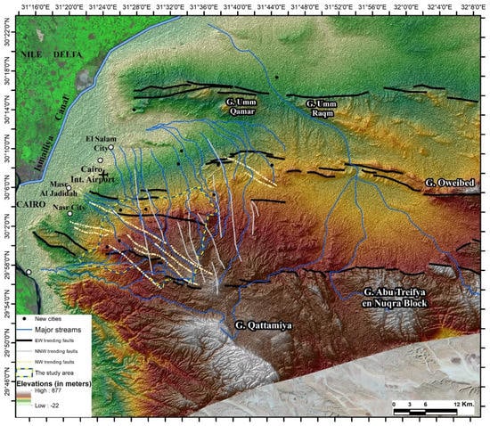 The study area is located east of Cairo and extends over 300 km2. It is bounded from the east by Cairo Ring Road (CRR), from the north by Cairo Suez Road, from the south by Ain Al Sokhna Road, and from the east by the water divides of Wadi Hamid, Wadi Al Anqabiyah Al Murowyanah, Wadi Al Halazoni and the water divides of a sub-watershed of Wadi Degla (Figure 1). The study area is a significant geographic area of the geologically known Cairo-Suez District (CSD) zone in the north of the eastern desert of Egypt. The long and complex geologic and tectonic history of CSD greatly controls the lithologic composition, structural configuration, and topographic expressions of the study area. The bedrocks of the study area range in age from Upper Eocene to Recent. The Upper Eocene rocks occupy a wide strip to the north of Cairo-Ain As Sokhna road in the study area (Figure 1). The spatial extent of Upper Eocene rock is ~29 km2, representing 9.7% of the entire study area. It is composed basically of marly limestone with detrital interbeds [,,,]. To the north of the Upper Eocene rocks, the Oligocene rock units occupy wide spatial extents of 191.6 km2, representing 64% of the entire study area (Figure 1). The Oligocene surficial rock units occur as wide strips in the middle of the study area and are composed of sand and gravel units with silicified wood in the base and basaltic sheets at the top [,]. To the north of the Oligocene rocks and along the Cairo-Suez Road, the Miocene rock units, with a total of 68 km2 occur, representing 23% of the entire study area (Figure 1). The Miocene rocks are comprised of basal marine units overlayed by nonmarine rock units [,]. Finally, the Pliocene rocks unconformably overlay the Miocene rocks in a considerable area of 11.3 km2 in the northeast reaches of the study area (Figure 1). The Pliocene rocks are comprised of reworked carbonate rock units [,]. Rock formations from the Upper Eocene to the Miocene have experienced multiple tectonic deformations []. These deformations produced different structural ridges and basins with various fault mechanisms and geospatial distribution [,,]. The high topographic representations in the study area occur in association with the Upper Eocene rocks in the south of the study area along Ain As Sokhna Suez road. However, the regional topography of the study area shows a decreasing trend in the north and northwest directions. These regional topographically decreasing trends are interrupted by E–W and WNE–ESE elongated ridges south of Cairo-Suez Road, along with scattered isolated hills. Between the ridges of high topography in the south and middle of the study area, gently sloping lowlands occur. The elevations of the study area range from 139 to 470 m, with an average of 300 m indicating high potential energy for developing mass movements. The geologic and tectonic settings, along with the topography, allow the formation and development of watersheds with mature stream networks in the study area in response to infrequent rainstorms.