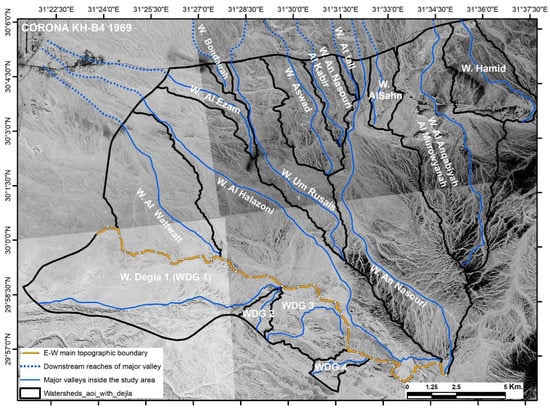 The study area comprises the upstream reaches of the north–northwest trending watersheds of W. Heliopolis, the upstream reaches of the nested northwest trending watersheds, and the northern upstream reaches of W. Degla (Figure 6). All the watersheds have trunk valleys defined by a name in the topographic maps of scale 1:50,000 (Figure 6). As the upstream reaches of W. Degla have so many small triangular southward trending watersheds, these watersheds can be categorized into four main watersheds: W. Degla 1 (WDG 1), W. Degla 2 (WDG 2), W. Degla 3 (WDG 3), and W. Degla 4 (WDG 4) (Figure 6). The CORONA images acquired on 9 December 1969, with a 1.8 m spatial resolution, enabled a clear definition of the boundaries of these watersheds (Figure 6). The boundaries of all watersheds are high and connect topographic edges that separate the given watershed from the surrounding watershed(s) (Figure 6). In addition, all boundaries of watersheds are fully and/or partially aligned well with the main east–west, north–northwest, and northwest tectonic fault trends. The foremost and highest topographic boundary in the study area is the east–west topographic boundary that separates both the north–northwest and northwest watersheds from the southward trending watersheds of W. Degla (Figure 6). Maintaining the boundaries of the main watersheds through urban planning is critical for successful watershed hydrological management in the study area. Three major landscape components exist within the topographic boundaries of each watershed that are highly important for successful spatial urban expansion in watershed landscapes; these components include stream networks, hillslopes, and structural lineaments.