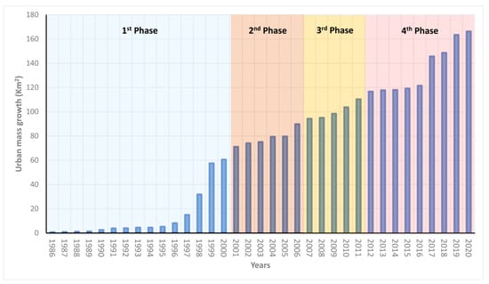 The systematic and regular acquisition of satellite images from the Landsat and ASTER earth observation systems enables scientists from different disciplines to monitor monthly and yearly dynamic spatial features, such as urban expansion. Images were collected on an annual basis for a 34-year period to monitor massive spatial urban expansions that occurred in the study area east of Cairo. Through this time period, a spatial urban expansion that was initiated with limited spatial extents from the 1980s to 2000 became rapid urban growth from 2000 to 2020 (Figure 7). The rates of urban growth varied at times throughout the entire study period in response to socioeconomic factors and the various regulations of urban policies. The spatial urban expansion in the study area east of Cairo can be categorized into four phases, according to the remarkable changes in the total urban mass and the growth rates (Figure 7).