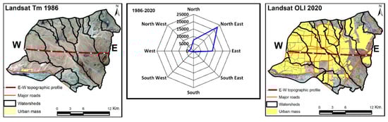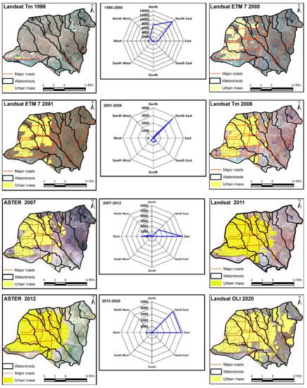 Sixteen main watersheds can be recognized in the study area. In response to the regional structural settings previously discussed, the boundaries of the watersheds and their major transporting valleys follow the major structural trends. Consequently, nine watersheds trend in the north–northwestern directions, three watersheds trend in the northwestern directions, and the watersheds of the W. Degla drainage basins trend in the southern directions. The primary topographic boundaries of the watersheds (water divides) and their main valleys determine the major spatial orientations of the watersheds. To determine whether the directions of spatial urban expansions align with the geospatial orientations of watersheds, a rose diagram of the urban growth was created for the previously defined four phases; these are 1986–2000, 2001–2006, 2007–2011, and 2012–2020. Figure 8 was produced with the satellite images acquired at the starting and ending dates of each phase. Both images are overlaid by the spatial extents of urban expansion through the phase. The rose diagrams of each phase are placed between the starting and ending images of each phase. In addition, the boundaries of watersheds are also displayed in the images. In the first phase, extending from 1986 to 2000, the spatial urban expansions were primarily in the northeastern direction, with a secondary northerly direction (Figure 8). In the phase of 2001 to 2006, the spatial urban expansions occurred principally in the northeastern direction (Figure 8). In the phase of 2007 to 2011, the spatial urban expansions were principally in the eastern direction, with a secondary northeastern direction (Figure 8). Finally, in the last phase, extending from 2012 to 2020, the spatial urban expansions in the study area were massive and equivalent in both the northeast and eastern directions (Figure 8). Overall, the net directions of the spatial urban expansions through the entire period extending from 1986 to 2020 have occurred basically in the northeast, with subordinate directions in the north and east (Figure 9). These directions may be controlled by road networks (Figure 8 and Figure 9) or by other administrative and urban planning policies. Plainly, the northeastern and eastern directions of spatial urban expansions are opposite to the principal geospatial orientations of both water divides and main valleys of watersheds in the study area (Figure 8 and Figure 9).