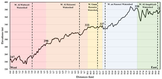 This opposition has resulted in the aggression of spatial urban expansions against the main morphologic components of the landscape, including water divides, main valleys, and the adjacent hillslopes around the main valleys. These morphologic components have distinctive topography at various regional and local scales. On the regional scale, the topography of the landscape varies significantly from 378 m in the east to 247 m in the west, with a total elevation difference in the range of 131 m (Figure 10). On the local scale, the eastern and western water divides of all watersheds present remarkable elevation differences, with the exception of W. Umm Russaiss (Figure 10). Similarly, all watersheds show high internal topographic variations with the exception of W. Umm Russaiss (Figure 10). Because the spatial urban expansions occur opposite to the geospatial orientations of the watersheds, these east–west elevation differences could represent core challenges to urban expansions. This setting would compel the urban planner to conduct planation processes on the landscapes before urban construction (Figure 11). Planation processes definitely change the topographic characteristics of the areas holding water divides. Altering the topographic characteristics in these areas could potentially displace the water divides in new locations. Watershed sizes could then be changed, resulting in increased sizes of some watersheds at the expense of the occupied areas adjacent to these watersheds. Accordingly, it is recommended that the hydrological parameters of all watersheds in the study area be studied and analyzed with these new morphologic and topographic settings for the purpose of establishing proper strategies to avoid flash flood hazards.