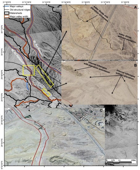 The aggression against water divides (A), the internal hillslopes (B), and planning across the major trunk valley of W. Al Halazoni (C).