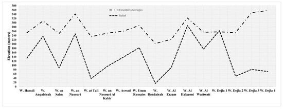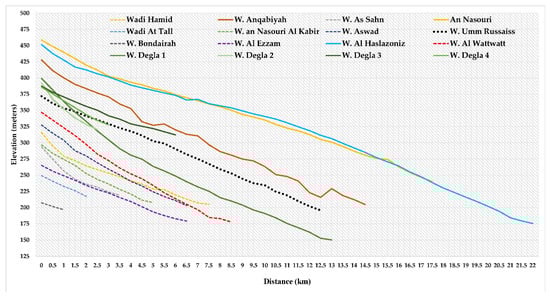 All watersheds have well-developed stream networks indicating the mutual interplay between potential topography and surface runoff. Each watershed has a main trunk valley that transports masses of water and sediment from the upstream hillslopes through stream networks. Morphologic and morphometric investigations of the main valleys imply high potentials for transporting masses of water and sediment. The main valleys actively incise in the bedrock without developing alluvial plains. They tend to be straight with sharp edges. The longitudinal topographic profiles of the main valleys were extracted from the DEMs of spatial resolution 30 m using the GIS 3D interpolation function technique of vector lines (Figure 12). The longitudinal topographic profiles indicate high potentials for the main valleys of watersheds to transport masses of water and sediment from the surrounding hillslopes into the main downstream reaches (Figure 12). The average elevations of the main valleys range from 202 m for W. Al Bondairah (a very short distance represented in the study area) to 357 m for Wadi Degla 4, with a mean value of 275 m asl (Figure 13). W. Degla 4, W. Degla 3, W. Al Halazoni, W. Umm Russaiss, W. Al Nasouri, and W. Al Anqabiyah have the highest elevation values (Figure 13). Most of these valleys also have the highest reliefs, ranging from 236 m for W. Al Anqabiyah to 248 m for W. Al Nasouri, 263 m for Degla 1, and 287 m for W. Al Halazoni (Figure 13).