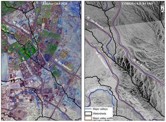 The CORONA images were subsetted to the boundaries of the study area and enhanced visually. The fine spatial 1.8 m resolution of these images qualified them for accurate definition and mapping of the various initial morphologic features in the study area, such as stream networks, watersheds, the centerlines of the major valleys of watersheds, and the boundaries of the main valleys of watersheds. In addition, many other structural origin features were clearly identified and mapped in the study area, such as structural ridges, dip slopes, and scarp slopes. The overlay analysis was used to compare the directions of spatial urban expansion with the geospatial orientation of structural features, water divides of watersheds, and the main valleys. In addition, the overlay analysis helped define urban masses that are directly located within the spatial extents of the valley floors of watersheds in the study area (Figure 3). To assess the possible impacts of the opposite expansion of urban growth against the geospatial orientation of watersheds, an E–W transverse topographic profile was constructed using DEM. To determine the potential of watersheds for producing flash floods, the topographic analysis of the main valleys was conducted using 3D interpolating shapes and zonal statistics. The 3D interpolating shapes of the centerlines of the main valleys enabled the production of longitudinal profiles of these valleys. Zonal statistics helped define the mean elevations and reliefs of the polygons of the main valleys for eventual evaluation of the potential of watersheds for producing significant flash floods. Using the above research design, it was possible to outline, understand, and discuss the interplay between the spatial urban expansion and the initial morphologic features in the study area through critical considerations, such as whether the directions of the spatial urban expansions are aligned with the geospatial orientations of watersheds, whether the watersheds in the study area are capable of producing flash floods, and whether the spatial urban expansions are vulnerable to the hazards of flash floods.