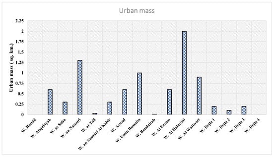 The analysis of longitudinal profiles, elevation means, and reliefs of the main valleys strongly indicates that the main valleys of the watersheds in the study areas have a high potential to develop powerful flash floods in response to infrequent rainstorms in the arid regions. The potential of these valleys to develop flash floods entails leaving the valley floors free from any urban expansion in order to avoid the hazards of possible flash floods. However, analysis of visual interpretations of the multi-temporal satellite imagery can help recognize the spatial relationships between spatial urban expansion and the valley floors of watersheds (Figure 14). Urban expansions have primarily occurred within the main valleys of watersheds in the study area (Figure 14). The hazards of flash floods alongside urban expansions within the main valleys in the study area have been reported and documented over the last few years []. Using GIS analytical functions and operations, it is possible to determine urban masses that are under the direct threat of flash flood hazards (Figure 15). A total area of 8.14 km2 of urban areas is directly located within the valley floors of the studied watersheds. The spatial extents of these urban areas vary from one valley to another (Figure 15). The urban areas threatened by flash floods increase in W. Al Halazoni, W. Al Nasouri, W. Umm Russais, and W. Al Wattwatt, reaching 2.0, 1.3, 1.0, and 0.9 km2, respectively (Figure 15). Limited urban areas under the threat of flash floods are recorded in other valleys (Figure 15). The valley floors of W. Hamid and W. Degla 4 did not have any spatial urban areas under the threat of flash flood hazards until the spatial urban expansion in February 2020 (Figure 15).