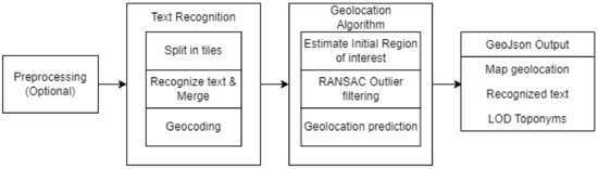 The paper is organized as follows: Section 2 discusses related work regarding text recognition, toponym matching, and automated geolocalization. Section 3 details the text recognition, geocoding, and the developed geolocation algorithm. Section 4 describes the datasets and presents the obtained results. Section 5 presents a discussion of our approach, summarizes the main benefits and drawbacks, and compares the results with related research. The paper finishes with a conclusion in Section 6.