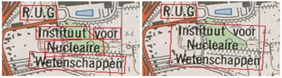 As of this lower accuracy on raster maps, pre- and post-processing techniques are frequently used to improve the results. A common approach is to first extract the text labels from the map and afterward perform text recognition. A combination of computer vision techniques, such as connected components analysis and color quantization, can be used to differentiate the text labels from the background of the raster maps. These techniques all generate similar results, namely binarized images that are easier to process [11,12]. As it can be difficult to differentiate the foreground text from the background automatically, a semi-automatic approach can be used to improve the results. Chiang et al. [13] developed a general, semi-automatic text recognition technique where users needed to label a small number of crops on the maps and indicate whether they contained text. They then used computer vision techniques to homogenize multi-oriented and curved text. These preprocessing techniques greatly increased the recognition accuracy of the used OCR software.