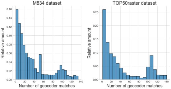 Each map contained an average of 365 and 671 usable text labels for the Belgian (M834) and Dutch (TOP50raster) datasets, respectively. A histogram of the geocoder matches per text label for both datasets is shown in Figure 5. It is clear that the distributions are asymmetric and that most text labels have a small number of matches. The labels with a larger number of matches are the least informative to predict an area of interest, as these denote common place names spread over a large area.