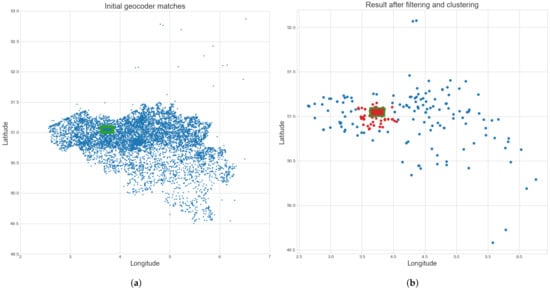 Coordinates of the initial geocoder matches before and after filtering and clustering. (a) Coordinates of the initial geocoder matches. The green rectangle denotes the ground truth geolocation of the map. The shape of Belgium is visible in the distribution of points (extreme outliers are not shown to improve the visibility of the figure). (b) The result after filtering and clustering of the initial coordinates. The largest cluster found is shown in red. The green rectangle denotes the ground truth geolocation of the map.