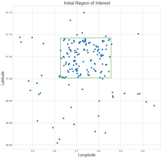Next, the remaining geocoordinates were clustered with the DBSCAN [21] clustering algorithm, which clusters higher density regions. This clustering eliminated additional outliers and was also used successfully in previous work [15,16]. We used the reciprocal of the number of geocoder matches as a sample weight for each point. In this way, points with multiple matches received a lower weight in clustering. The bounding box of the found cluster was taken as the initial region of interest. If multiple clusters were found, the one containing the most points was selected. Figure 6b displays the result after discarding the low-probability coordinates and clustering. A more detailed plot of the remaining coordinates after determining an initial region of interest for the map of Gent-Melle is shown in Figure 7.