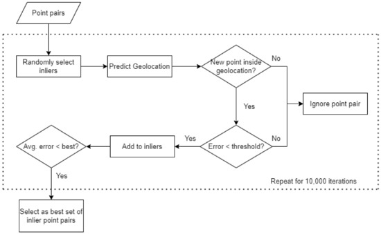 We used a RANSAC-based approach to remove most false-positive coordinate matches. RANSAC is a generic iterative algorithm that can fit a model while still being robust to outliers [22]. Figure 8 gives an overview of the RANSAC-based outlier filtering. First, a set of inlier point pairs was randomly selected from all possible point pairs. Each recognized text label and corresponding pixel location on the raster map was given a 50% probability of being selected. For each selected pixel location, we then randomly chose one of the corresponding geocoordinate matches. This produced a randomized set of point pair inliers. Assuming these inliers were correct, the map geolocation was predicted (see Section 3.6). This geolocation was then used to filter the selection of additional point pairs in the RANSAC algorithm. For each other point pair not initially selected, we performed two checks to decide if these should be added to the set of inliers. First, we checked if the geocoordinates were inside the predicted geolocation. Next, the relative position error (see Section 3.7) was calculated. If the point was inside the geolocation and the error was smaller than a predetermined threshold, we added the point as a candidate inlier. Finally, both the initial inliers and new candidates were used to make a new prediction of the map geolocation and calculate the average relative distance error over all selected point pairs. This entire process was repeated for 10,000 iterations and the set of point pairs with the lowest average error was chosen for further processing.