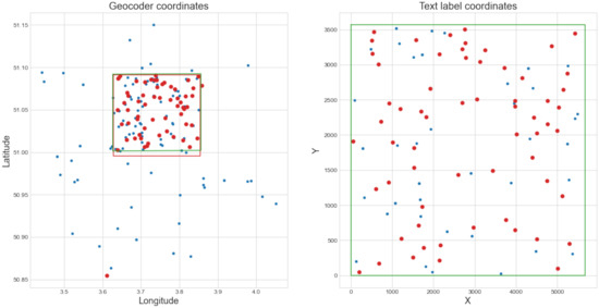 The approach does not depend on how the text labels and geocoder matches were generated; therefore, it can be used with any text recognition system and geocoder. The geolocation accuracy largely depends on the text recognition accuracy and geocoder results. If the map is of low quality and most text labels are not recognized, the results will be poor. For each text label, we define its location on the map as the center point of the text detection bounding box. Ideally, we want a list of pixel locations and a correct geocoordinate location for each, allowing the use of all these point pairs to georeference the map. However, since both the text recognition and geocoder results contain errors, we cannot be certain that any toponym and geocoder match is correct. Only the position of each text label on the map is relatively accurate. To get more accurate results, geocoder matches that have a low probability of being correct need to be filtered out. All figures presented in this section refer to the same topographic map of Gent-Melle, from dataset M834 (see Section 4.1). Each figure presents the point pairs currently considered at each step of the algorithm.