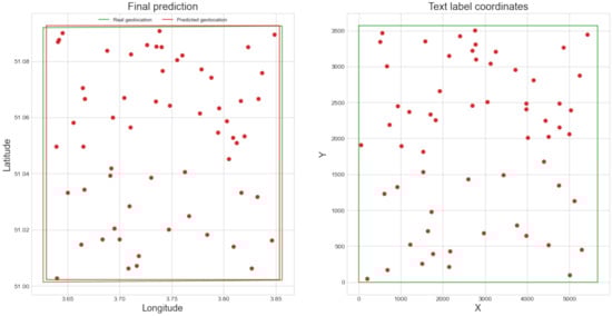Weinman [14] used this information along with known toponym geocoordinates and feature label placements to construct a probabilistic model that improved text recognition accuracy. He reduced the word error rate by 36% compared to the raw OCR output. In [15], the framework for an automated open-source map processing approach is presented. Part of the framework includes a module for automatic geolocalization. As a preliminary result of this module, the first toponym match for a label with a confidence value of 90% or more obtained from the Google Geocoding API was used to geolocate each map. The geocoding results were clustered and the centroid of the largest cluster was used to predict the actual center of the map. The approach was then validated on 500 randomly selected maps from the NYPL georectified map collection (http://spacetime.nypl.org accessed on 20 May 2022). The results were promising: 37% of the geolocated maps were within a 15 km radius from the ground truth coordinates and 28% were within a 5 km radius. The authors noted that considering only a single toponym match for each text label was very restrictive and that the text recognition sometimes failed to detect enough text labels. In a follow-up work by the same authors, they developed a text linking technique that further improved results [16]. By using both the textual and visual content, they were able to train a model that could correctly link multiple words of the same location phrase (e.g., linking “Los” and “Angeles” to “Los Angeles”). The text linking greatly reduced the number of false-positive geocoder matches and made the geolocation more precise.