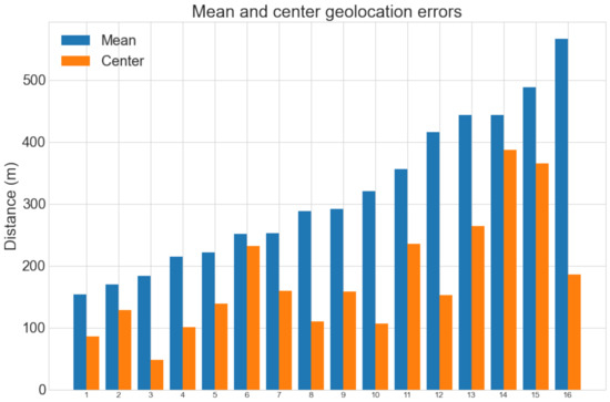 Max. error denotes the largest mean error for any map. Note that the center error distance does not give any indication of how large the predicted map region is compared to the ground truth geolocation and is therefore usually much smaller than the mean error. The average mean error distances for the M834 and TOP50raster datasets were 316 m (1.67% with respect to the map diagonal) and 287 m (0.90%), respectively. The largest mean error distances were 631 m (3.33%) and 438 m (1.37%), respectively. Considering the small error distances with respect to each map’s size, these results are very promising and accurate enough to use in practice. The full results for the M834 dataset are shown in Figure 11. Of the 16 predicted geolocations, 15 have a mean error of less than 500 m and 11 have a center error of less than 200 m.
