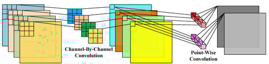 Depth separable convolution is a common convolution operation in lightweight network models []. Compared with the conventional convolution operation, its parameter amount and operation cost are much lower. Depth separable convolution divides a complete convolution operation into two steps through channel-wise convolution and point-wise convolution. Figure 3 is a schematic diagram of the convolution process of depth separable convolution.