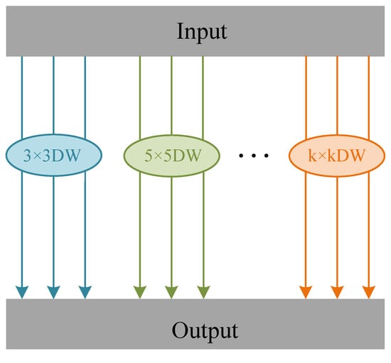 The hybrid depth convolution first divides the feature map into multiple groups according to the channel. In general, the feature map is divided into 1–5 groups. In this paper, the feature maps are divided into four groups. After dividing into groups, we need to use different sizes of convolution kernels for each group to perform convolution, where we use channel-by-channel convolution. For the size of each group of convolution kernels, we set the size of the convolution kernel sequentially in the manner of , i represents the number of each group. Since the feature maps are divided into four groups, i is incremented from one in the first group to four in the fourth group. As for the division of convolution kernel channels, there are two division methods. The first type is equal division; that is, the number of channels of each group of convolution kernels is the same; the second type is divided by exponents. For the first group, the number of channels in each group accounts for of the total number of channels. The number of channels in the last group is the remaining channels. In the model in this paper, the method of dividing by index is selected. After completing the above operations, we spliced these channels together to complete the hybrid depth convolution operation.