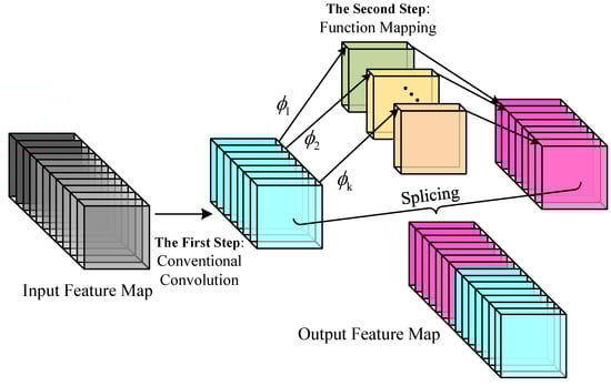 After the original feature map is generated, in order for it to be the same as the ordinary convolution, we need to obtain another m feature maps. Next, we carry out the second step, through cheap linear or non-linear calculations: mapping to generate the remaining half of the feature map, Figure 7. and represent the second step of the intrinsic feature mapping module. We use a series of cheap linear or non-linear operations on each original feature in . In theory, each original feature can be mapped to generate s new feature maps: