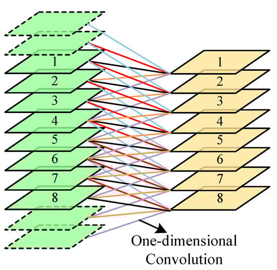 Where represents a one-dimensional convolution. It should be noted here that to ensure the one-to-one correspondence between the characteristic channel and its attention prediction weight, the padding term in the one-dimensional convolution needs to be set to and rounded down (Figure 9). It represents the real process of weight learning by one-dimensional convolution when the influence range of cross-channel interaction in the lightweight adaptive attention mechanism is .