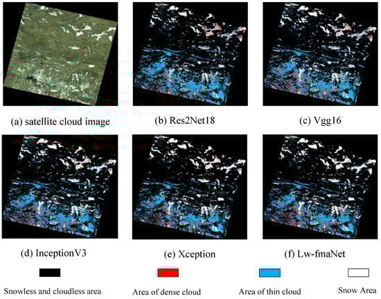 Next, we give the generalization effect of cloud and snow recognition for different models (Figure 10). In this paper, we select a satellite cloud image of the plateau area with high complexity and many interference scenes and compare the lightweight feature mapping attention network with the popular convolutional neural network. Figure 10a is a satellite cloud image. Figure 10b shows the generalization effect of cloud and snow recognition of Res2Net18; the network improves the original residual block by connecting the hierarchical residuals within the residual block and increasing the range of the hierarchical receptive field by convolution. Figure 10c for the generalization effect of Vgg16, the network constructs a 16-layer convolutional neural network using a convolution kernel and a maximum pooling operation. Figure 10d for the generalization effect of cloud and snow recognition of InceptionV3, the network adds an RMSProp optimizer and label smoothing based on InceptionV2. Figure 10e for the generalization effect of Xception, the model changes the convolution in Inception v3 into depth separable convolution and adds residual connection. Figure 10f generalization effect of cloud and snow recognition for a lightweight feature mapping attention network.