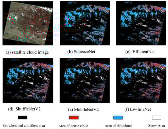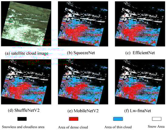 Further, we compare the generalization effect graph of the lightweight feature mapping attention network with that of the lightweight model, as shown in Figure 11. The cloud and snow generalization effect map of SqueeeNet is formed through the accumulation of Fire modules. The module has two layers; the first layer passes through a convolutional compression channel, and the second layer passes through and convolutional expansion channels. Figure 11c, for the cloud and snow generalization effect map of EfficientNet, a new network size scaling method is proposed, and the optimal network structure is searched through NAS. Figure 11d is the cloud and snow generalization effect map of ShuffleNetV2. The network divides the channel into two branches; one branch performs the same mapping, and the other branch contains three convolutions. After the two branch operations are completed, the feature maps obtained by them are connected in series. Figure 11e is the cloud and snow generalization effect map of MobileNet V2. The network uses depth separable convolution and proposes inverted residual blocks with bottleneck structure. Figure 11f is the cloud and snow generalization effect map of the lightweight feature mapping attention network. In this set of generalization results, we can see that there is a large area of thick clouds in the lower left of the satellite cloud image of the plateau area, but there are a lot of false detections in SqueeeNet, EfficientNet, and ShuffleNetV2, and some areas of these models are mistakenly detected as snow, resulting in poor generalization effect in this area. The lightweight feature mapping attention network has less false detection in this area, so the recognition generalization effect in this area is the best. For the generalization effect of the whole graph, we can find that, compared with the other four lightweight models, in the generalization graph of the lightweight feature mapping attention network, the edge contour of each region is clear, which is closest to the real result.