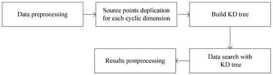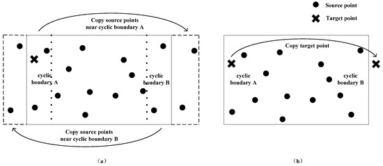 The process of the mirror method based on source points duplication is shown in Figure 2. The first step is to perform data preprocessing, that is, placing all the source points and the target points within a specified loop segment for each cyclic dimension. Subsequently, the source points near one cyclic boundary are copied to the outside of another corresponding cyclic boundary for each cyclic dimension. The scope of the duplication can be determined by the distribution characteristics of source data. For example, if the maximum distance between any position in the search space and its closest source point is L, only the source points within the range of L from the cyclic boundary need to be copied. In fact, the precondition can be further weakened. As long as the source point density near the cyclic boundary reaches such condition, the limited duplication method still works. However, if the distribution characteristics of the source data are unknown or unsure, the maximum duplication area for each cyclic boundary would be half of the original search space. It should be noted that all the duplications should be based on the original location of the source data. After copying the relevant source points for each cyclic dimension, the KD tree can be constructed and the nearest point can be found according to the classical algorithm (more details about these classical algorithms can be seen in [25]). The final step is to map the search results back to the original region or the original point number, similar to the data preprocessing.
