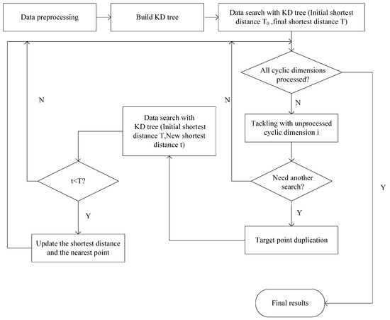 The process of the mirror method based on target points duplication is shown in Figure 3. Initial works, including data preprocessing, KD tree construction, and general nearest point search, are the same as the normal nearest neighbor search based on KD tree. The initial shortest distance T0 is usually set to a negative number or a sufficiently large value. After the first round of data search, the final shortest distance between the target point and its closest source point is obtained as T. Subsequently, we must approach each cyclic dimension by a special method. For the sake of simplicity, these cyclic dimensions could be processed in turn. When tackling the unprocessed cyclic dimension i, a comparison between the distance from the target point to its nearest cyclic boundary in the i-th dimension S and current shortest distance T should be done at the beginning. If S is not less than T, it means that source points near another cyclic boundary in the i-th dimension cannot be closer than current point. Thus, there is no need to search again for the other cyclic boundary, and we can now start to process the next cyclic dimension. Otherwise, you would need a further search in current cyclic dimension. Before starting a new search, we need to copy the target point to the same relative position outside the corresponding cyclic boundary. The following search could adopt the current shortest distance T as the initial shortest distance value, as it may help us cut off more unnecessary branches in the new search. Assuming that the new nearest distance is t, we should make a comparison between t and T, and select the smallest result as the latest result. It is worth mentioning that if the final nearest distance and the final nearest point use the pass by address mechanism in programming, the update operation can be omitted. After all the cyclic dimensions have undergone the operations described above, the shortest distance and the corresponding source point obtained would be the final result.