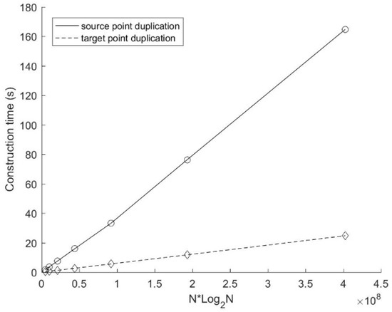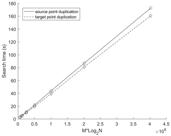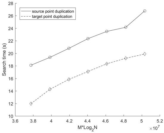 The formula deduced above demonstrates that the growth trend of the search time of the source points duplication method depicted in Figure 5 is reasonable. In addition, it can be seen clearly that the growth rate of the search time of the target points duplication method decreases significantly with the increase of source points number. This is because the augment of source points would generally reduce the number of target points duplication.