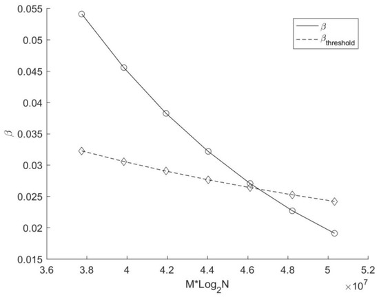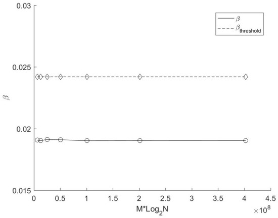 Figure 8 shows the search time of these two methods with a different number of target points. In this experiment, the number of data dimensions and the number of cyclic dimensions is the same as those in the previous experiment (i.e., K = 4, C = 4). The number of source points N is fixed at 224, while the number of target points M varies from 218 to 224 (doubled each time). Obviously, the search time of both methods increases linearly with the number of target points. In addition, the search time of the target points duplication method still performs better than that of the source points duplication method. Figure 9 depicts the variation of β and βthreshold with a different number of target points in this experiment. As can be seen from the picture, βthreshold is a constant, and is always greater than β. Therefore, it makes sense that the search time of the target points duplication method is less than that of the source points duplication method in this experiment. Moreover, although the actual average replication ratio β fluctuated slightly, it remained stable on the whole. In other words, for data sets with randomly generated elements, the variation of M will not lead to a significant change in β as long as M is large enough.