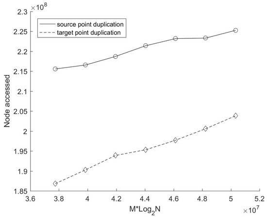 In order to further verify our inference, we counted the number of nodes accessed in the search process (i.e., the number of times to calculate the distance) of these two methods (see Figure 7), because this is the most time-consuming part of the whole search process. As can be seen from the figure, the number of nodes accessed in the source points duplication method is always higher than that in the target points duplication method, which is also the direct reason why the search time based on source points duplication is always higher than that based on target points duplication.