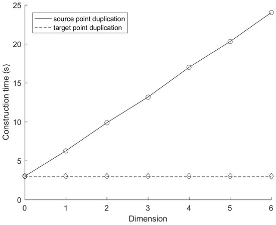 The first term on the right side of Equation (8) increases slowly with the increase of C, while the second term is a constant. Therefore, the trend of the construction time of the source points duplication method is reasonable. Figure 11 shows that the search time of the target points duplication method is basically linear with the number of cyclic dimensions. This is because the derivative of the search time of the target points duplication method (Equation (4)) to the cyclic dimension is: