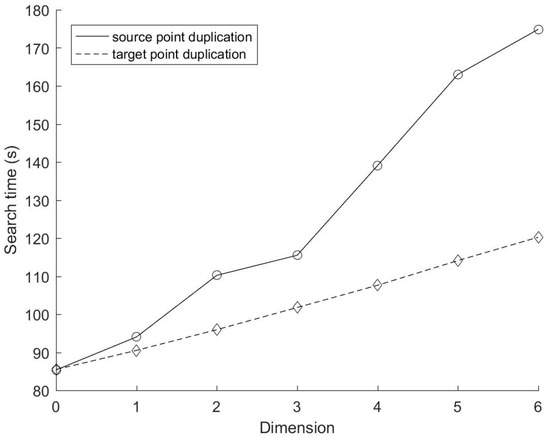 In this experiment, the number of source points and target points remain unchanged, and all these points are evenly distributed, and the range of each dimension is the same, so the actual target point replication ratio is almost the same for each dimension, which means β can be regarded as a constant. Therefore, it is reasonable that the search time of the target points duplication method increases linearly with the number of cyclic dimensions in this experiment. The search time of the source points duplication method changes irregularly with the cyclic dimension, and is always higher (except C = 0) than that of the target points duplication method.