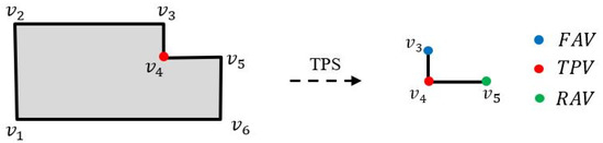 As buildings have different shapes, classifying TPS is the basis of the simplification operation. There are three vertices in the TPS, which are FAV, TPV, and RAV. We distinguish the TPS with the concave–convex and orthogonality of the three vertices, as Table 2 shows.