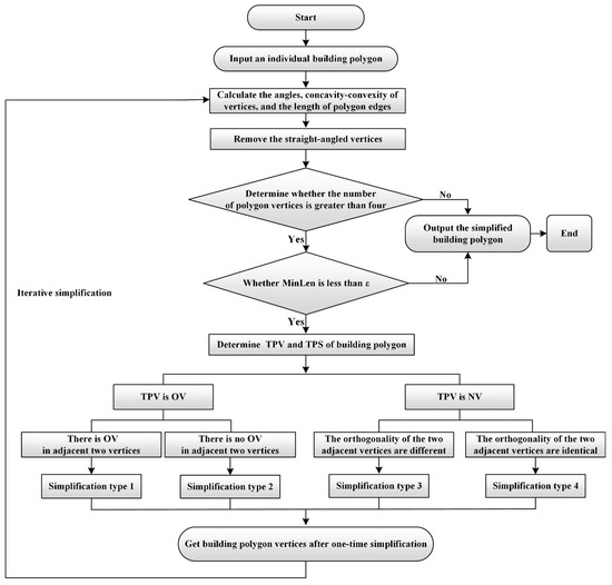 This study only discusses the simplification of the outer contour of buildings. According to the concavity–convexity and orthogonality of TPV and its two adjacent vertices, the types of simplification are classified, adopting different simplification algorithms. The minimum structure of a building polygon is simplified iteratively until it meets the requirement of simplification. The flowchart of simplification is shown in Figure 4.
