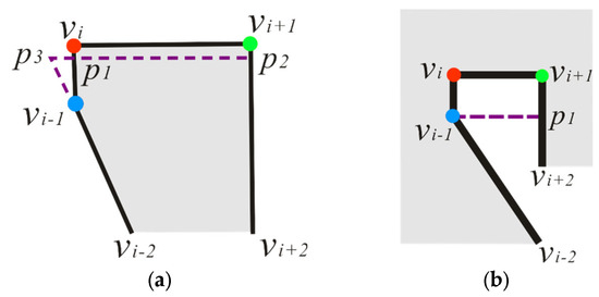 Subtype 9: This simplification of the subtype is independent of convexity–concavity of TPV and its adjacent vertices. As Figure 8a shows, draw a line parallel to , in which is on , and is on . Prolong and to intersect and at and , respectively. The area of the filled triangle is equal to the sum of area of the deleted triangles and . Then, the local structure is simplified as . In the special case that and are co-linear, is directly deleted. As Figure 8b shows, the local structure is simplified as .