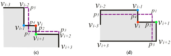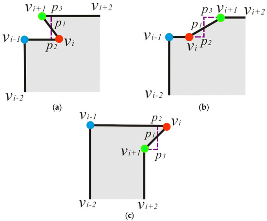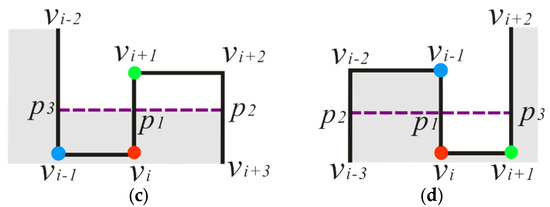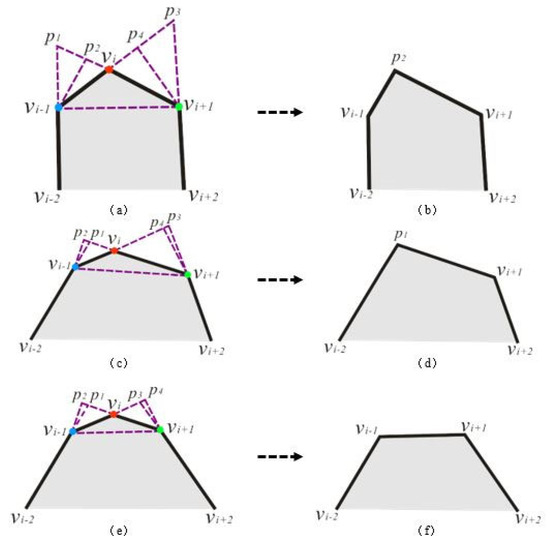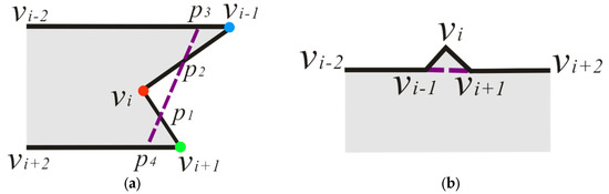 Subtype 10: . This simplification of the subtype is independent of convexity–concavity of TPV and its adjacent vertices. As Figure 9a–c shows, draw a line perpendicular to , in which is on , and is on . Denote the distance from to as . Prolong to while the length of is . The area of the triangle is equal to the triangle . Then, the local structure is simplified as . When is parallel to , as Figure 9a,b shows, , , are collinear after simplification. is a flat-angled vertex, which will be deleted in the next iterative simplification process, see Section 3.4, Step 2 for details.