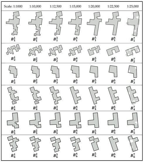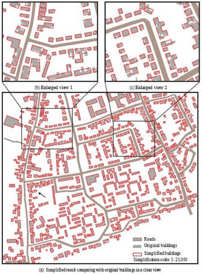 As shown in Figure 14, the simplification method proposed herein gradually simplifies the outline and local details of buildings with reducing scale, which reflects the progressive and multi-scale expression of simplification. We can realize the process by adjusting scales to determine the minimum granularity. As transforms to , the minimal and unimportant details are deleted preferentially. The complex-shaped buildings are simplified to a simple one, which also preserves the main shape characteristics, e.g., . Since the orthogonal characteristic of buildings is preserved well in continuous scale transformation, the results show that the proposed method simplifies rectangular buildings commendably, such as and in Figure 14. In addition, our method could keep the area of buildings before and after simplification by comparing the simplified outlines and original buildings at a scale of 25,000 in Figure 14, instead of simply removing vertices. Therefore, the proposed method has advantages in keeping the simplification result stable and controllable in continuous scale transformation of buildings.