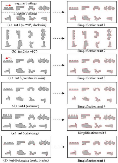 ① Test of directional dependence. Rotate the buildings with rotation angles of 90° in Figure 15b. From the simplification results, the simplification results of buildings in different angles are consistent, which confirms that the proposed method does not depend on the direction of buildings. ② Test of changing vertices sequence as counterclockwise, as Figure 15c shows. The simplification result 3 is the same as simplification result 1, confirming that our method provides the same output for the buildings encoded clockwise and counterclockwise. ③ Test of extrusion and stretching. In simplification, buildings may be stretched and extruded to different degrees. The buildings in Figure 15d,e, are obtained by extruding and stretching the buildings in Figure 15a, respectively. By comparison of simplification results 1, 4, and 5, the results of simplification are similar, with some local differences. It shows that this algorithm can simplify according to the shapes of different buildings, keeping the original shape characteristics of buildings in general. ④ Test of adjusting the start vertex. The buildings in Figure 15f are acquired by changing the start vertices of buildings in Figure 15a. The start vertices are denoted as red points in Figure 15f. Simplification result 6 is the same as simplification result 1, which confirms that the changing the sequence of vertices has no effect on the simplification result.
