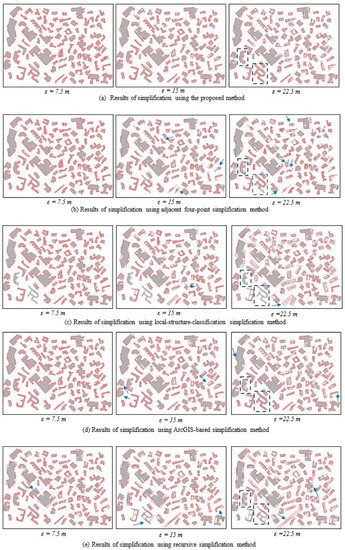 Figure 16 shows that all the methods of simplification preserve the basic shape features of buildings and have an effective consequence on conventional buildings. However, the comparison of simplification effects shows that when the span of simplification scale is large, that is, when the simplification threshold is significantly larger than the length of edges in buildings, the proposed method is more suitable for the original outlines of the buildings and the simplification result is more stable compared to the existing methods. In the adjacent four-point method, the shape features are obviously changed due to sharpening, as shown by the blue arrow in Figure 16b. Individual buildings have some change in the shape in the local-structure-classification simplification method, as shown by the blue arrow in Figure 16c. The ArcGIS-based building simplification method fails to consider the area of some complex buildings during simplification. Moreover, the short edges of some buildings are not eliminated when = 22.5 m, as shown by the blue arrow in Figure 16d. The simplification result of the recursive method does not fit well with the shape of the original buildings. Because the recursive method determines the rotation angles according to the minimum bounding rectangle (MBR) of buildings, this leads to the direction deviation for some complex buildings, as shown by the blue arrow in Figure 16e. The buildings that are shown by the blue rectangles in Figure 16 are circular-shaped buildings. The proposed method maintains the circular-shaped characteristics in comparison with other methods. Specifically, the local-structure-classification simplification method fails to simplify some circular-shaped buildings. The ArcGIS-based method could keep the circular shape as a whole. However, some small structures are not simplified in the ArcGIS-based method. The adjacent four-point method and recursive method have comparatively large changes in shape characteristics for circular-shaped buildings.