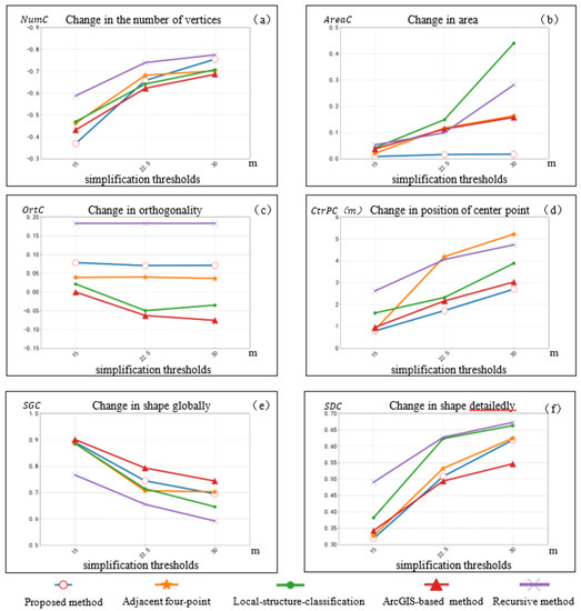 Comparison of simplification methods at different thresholds: (a) NumC, (b) AreaC, (c) OrtC, (d) CtrPC, (e) SGC, (f) SDC.