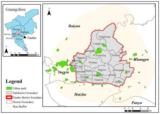 This study was conducted in Tianhe District, located in the middle of Guangzhou (Figure 1). Tianhe District has a total terrestrial area of 137.38 km2, which contains 21 subdistricts (called “jiedao”). According to the 2021 Seventh National Population Census, the current resident population of Tianhe District is 2,241,826. The transportation resources in the district are concentrated, with a multilevel urban transportation system that includes metro, bus rapid transit system, and urban ring expressway. Tianhe District is not only the most economically developed district in Guangzhou, but it also focuses on the transformation of green spaces to achieve the goal of “city in a park”.