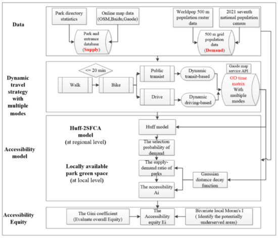 Figure 2 represents the framework proposed in this study. A H2SFCA model based on supply and demand was used to quantify the accessibility levels. Three key elements of the H2SFCA model were population data (demand), urban park locations, and area data (supply), as well as the travel time between demand and supply.