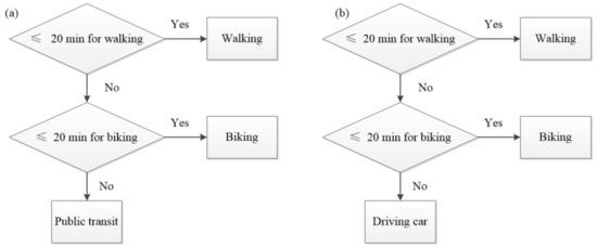 People can flexibly choose how to travel to parks based on travel time, transportation facilities, and their socioeconomic status. As a result, estimates of park accessibility using a fixed travel mode would be biased. For example, residents near the park would prefer walking or cycling, but residents far away would choose public transport or driving. In China, private cars and public transport are the main ways for urban residents to travel long distances [37]. Thus, we created a multimodal travel strategy by combining walking, biking, public transport, and driving to measure park accessibility (Figure 3). This strategy assumes that people use public transit or driving cars for long-distance travel, whereas prefer walking or cycling for short distances. If the travel time is less than 20 min, then walking is selected first, followed by biking; if the travel time is more than 20 min, then public transit or driving is selected. This strategy includes two scenarios, as shown in Figure 2. Scenario (a) is a dynamic transit-based mode and scenario (b) is a dynamic driving-based mode, which are suitable for different people. Here, we set a threshold of 20 min because people generally tolerate walking and biking for less than 20 min [23,24,37]. A previous study suggested that walking or biking for 15–25 min per day is better for people’s health [38].