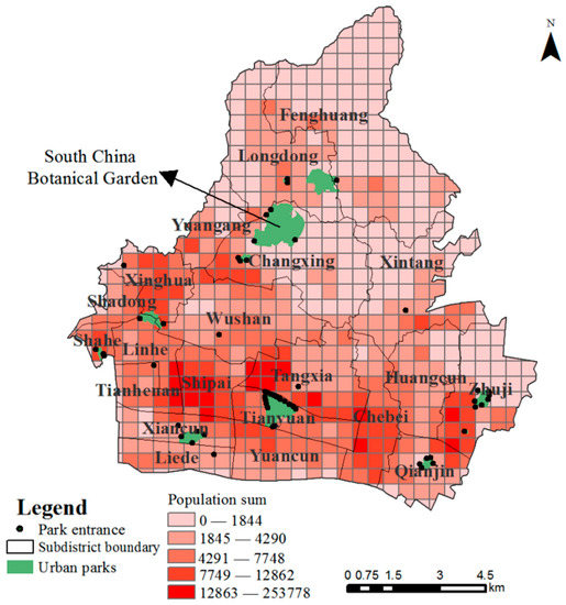 To reduce the influence of spatial scale on accessibility evaluation, we studied the demand population in a 500 m × 500 m grid unit. The population data were provided by the 2020 WorldPop raster population data with a 100 m resolution (https://www.worldpop.org/geodata/summary?id=24926, accessed on 1 March 2022) and the 2021 Seventh National Population Census in Guangzhou. First, the population raster data were modified at the subdistrict scale with the census data. The correction coefficient was obtained by dividing the total census population by the total population of WorldPop of the corresponding subdistrict. Since the correction coefficient is a float number, the final population data were rounded to the nearest integer. Then, 500 m × 500 m grids were built in this area by ArcGIS 10.2 fishnet tool and 612 grids in Tianhe District were acquired. The population raster data were converted to point data, with the population-weighted centroids of each grid obtained as the demand point location. The total raster populations within each grid were calculated as the demand population number. We selected 500 m as the resolution because the coverage rate of park service areas is calculated at 500 m in the Special Plan for Guangzhou Park Construction and Protection (Draft) (2017–2035). In addition, the planned scale of the 5 min living circle is about 600 m × 600 m. Given the above two points, we used 500 m as the resolution, which is consistent with the planning scale and more convenient for practical management [36].