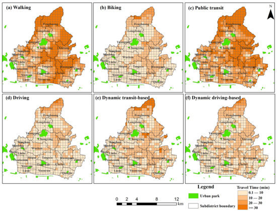 Time distribution of each grid reaching the nearest park for different travel modes. (a) Time distribution for walking; (b) Time distribution for biking; (c) Time distribution for public transit; (d) Time distribution for driving; (e) Time distribution for dynamic transit-based mode; (f) Time distribution for dynamic driving-based mode.