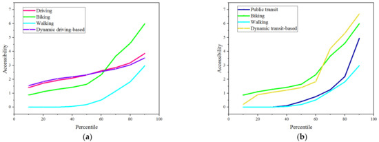 The average value is affected by some significantly high accessibility values and cannot represent the overall distribution of accessibility indicators of each mode. Therefore, we also analyzed and compared the accessibility values at different quantiles (see Figure 6). (1) We compared the dynamic driving-based accessibility with the three related single travel modes. The results show that in the 10–90% percentile, the accessibility value by the dynamic driving-based mode is higher than that by walking, which is similar to that by driving. When the accessibility value is within the 60th percentile, the accessibility value for the dynamic driving-based mode is higher than that for the biking mode; however, when the accessibility value is between the 60th and 90th percentiles, the dynamic driving-based accessibility value is lower than that of the biking mode. (2) We also compared the dynamic transit-based accessibility with the related single travel modes. The results show that in the 10th–90th percentile, the accessibility value of the dynamic transit-based mode is higher than that of the public transit and walking modes. When the accessibility value is within the 60th percentile, the accessibility value of the dynamic transit-based mode is lower than that of the biking mode, but when the accessibility value is between the 60th and 90th percentiles, the dynamic transit-based accessibility value is higher than that of the biking mode. Generally, the supply–demand ratio of the park and the travel time influence the accessibility value, and the accessibility comparison relationship under different quantiles is more complicated.