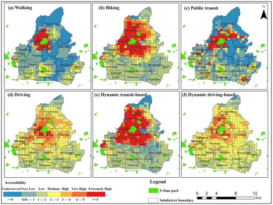 Accessibility level distribution of each grid for different travel modes. (a) Accessibility for walking; (b) Accessibility for biking; (c) Accessibility for public transit; (d) Accessibility for driving; (e) Accessibility for dynamic transit-based mode; (f) Accessibility for dynamic driving-based mode.