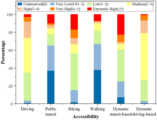 To further explore the differences in the accessibility distribution between dynamic and single travel modes, we compared the spatial extent percentage of accessibility at various levels (see Figure 8). For the dynamic transit-based mode, the overall level of accessibility is better than that for walking and public transit. The number of grids with extremely low (≤1) and extremely high (>5) accessibility values for the dynamic transit-based mode exceeds that for biking, whereas the number of grids with medium and high accessibility values (1–5) is less than that for biking. A possible reason is that the biking mode overestimates the residents’ access with a travel time greater than 20 min; thus, the accessibility value increases. Conversely, for the dynamic driving-based mode, the overall level of accessibility is better than that for the single walking mode, as the grids with medium and high values are not limited to the periphery of the park. In comparison with driving and biking, the low- and high-value accessibility extent of the dynamic driving-based mode is smaller, whereas the intermediate accessibility value extent of the dynamic driving mode is larger. For example, a comparison of the dynamic driving-based mode and the single driving mode shows that the high-value accessibility extent (≥3) near the South China Botanical Garden decreases, whereas the medium value accessibility extent (2–3) in the southern area increases. Generally, the dynamic driving-based mode reduces the estimation of extreme values. Thus, the overall accessibility values tend to be more in the middle range, with the spatial disparity between them considerably smaller.