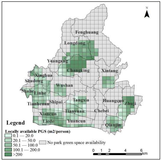 On the other hand, residents will also tend to go to the surrounding parks and green spaces in their daily lives. Therefore, we further analyze the park green space availability at a local level. The results show that the PGS availability pattern is similar to the accessibility by walking (see Figure 9). The number of grids without PGS availability is 408 and the standard deviation is 84.88. The underserved grid number is higher than that in accessibility by walking. Overall, the availability of PGS is related to the location, size of PGS, and local population density.