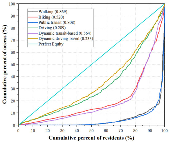 The Lorenz curve [42] graphically represents the distribution of green space resources among the resident population. The value of the Gini coefficient ranges from 0 to 1. The lower the Gini coefficient, the more equal the residents’ access to public green space resources will be, with 1 being completely unequal. We calculated six Lorenz curves and Gini coefficients to compare the equity of park accessibility for different travel modes (see Figure 10). The results show that there exist differences in the park accessibility equity under different travel modes. Park accessibility equity is best in the dynamic driving-based mode, followed by driving and biking, dynamic transit-based mode, and finally public transit and walking modes. The accessibility equity for the dynamic driving-based mode is improved compared to the single driving mode, as indicated by the Gini coefficient value decreasing from 0.289 to 0.233. Similarly, the accessibility equity in the dynamic transit-based mode is also improved compared to the single transit mode, with the Gini coefficient decreasing from 0.808 to 0.564. This result suggests that park accessibility is more equitable by dynamic modes. Using a single model may underestimate the accessibility equity of parks.