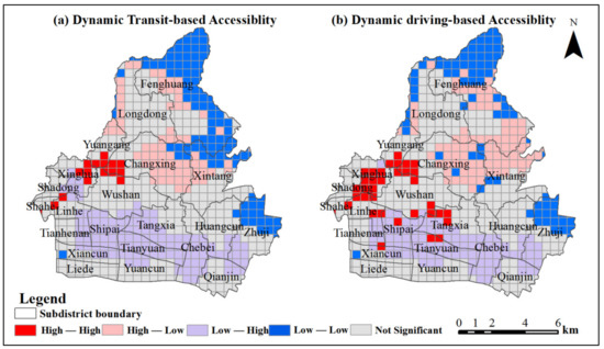 LISA map for two dynamic travel modes and population. (a) LISA map for dynamic transit-based accessibility; (b) LISA map for dynamic driving-based accessibility.